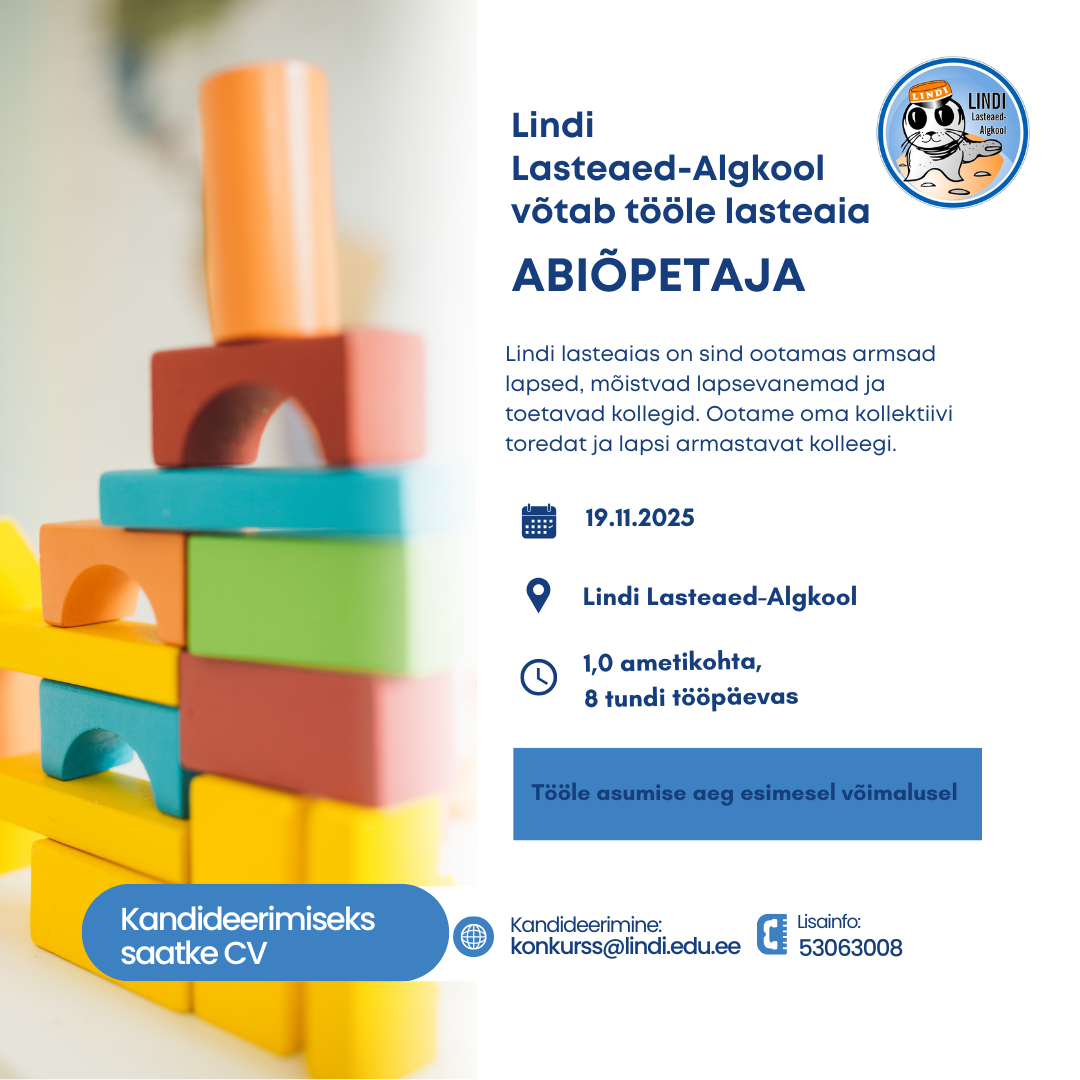 Lindi Lasteaed-Algkool kuulutab välja konkursi liikumisõpetaja (0,27) ametikoha täitmiseks Loomise kuupäev 21.11.2025 Autor Egle Rumberg 1. advendi kontsert Loomise kuupäev 12.11.2025 Autor Kärt Jürgens Ujumisaegne tunniplaan Loomise kuupäev 22.10.2025 Autor Kärt Jürgens Isadepäeva pidu Loomise kuupäev 21.10.2025 Autor Kärt Jürgens Vaata rohkem